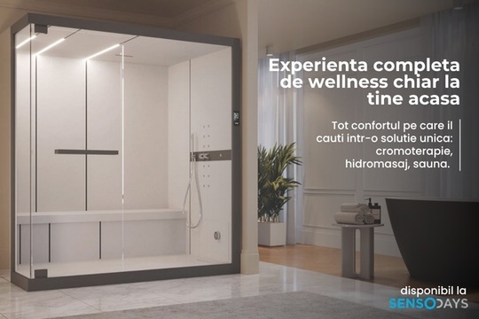 Wellness acasă cu cabinele de duş cu funcţii inteligente. De exemplu, cabinele de duş Novellini, disponibile la SensoDays, aduc experienţa unui spa direct în locuinţa voastră. Cu design modern, funcţii inteligente şi un confort desăvârşit, acestea transformă baia într-un colţ de relaxare zilnică.