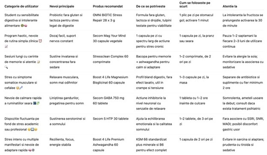 Produse precum Secom GABA 750 mg, Mag-Your-Mind, Boost 4 Life Ashwagandha sau OMNi-BiOTiC Stress Repair oferă formule adaptate nevoilor studenţilor - de la calmarea sistemului nervos şi îmbunătăţirea somnului, până la susţinerea funcţiilor cognitive şi reducerea epuizării mintale. Alegerea suplimentului potrivit depinde de tipul de stres resimţit: dacă tensiunea afectează somnul, digestia sau concentrarea, fiecare dintre aceste produse poate acţiona complementar pentru restabilirea echilibrului natural al organismului.