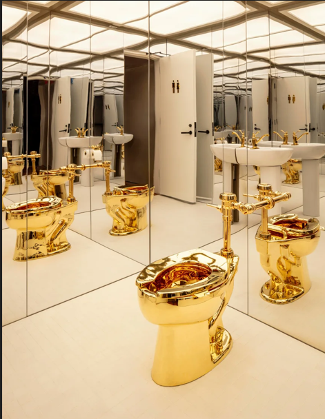 În plus, cea mai neobişnuită ofertă a licitaţiei, toaleta de 220 de kilograme din aur de 18 karate a artistului conceptual şi enfant terrible Maurizio Cattelan, a atras o singură ofertă. Sculptura opulentă, intitulată ”America”, este o soră a versiunii infame, care a fost expusă la Guggenheim ca toaletă funcţională şi ulterior furată din locul de naştere al lui Winston Churchill, Palatul Blenheim, şi niciodată găsită.