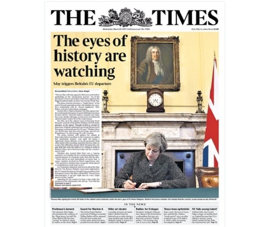 Într-o notă mai sobră, The Times a optat pentru titlul “The eyes of history are watching” (”Ochii istoriei urmăresc”), încadrat lângă portretul lui Robert Walpole, primul prim-ministru al Marii Britanii, tablou care apare deasupra unui şemineu în faţa căruia Theresa May a semnat scrisoarea.
