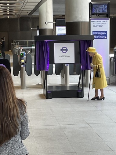 Suverana, purtând o pălărie şi o haină galben aprins şi folosind un baston, a dezvelit o placă la Gara Paddington. I s-au alăturat fiul ei Edward, prim-ministrul Boris Johnson şi primarul Londrei, Sadiq Khan. Ea a fost surprinsă şi când a folosit şi aparatul cu carduri din staţia de metrou.