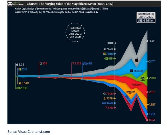 Aceste companii-gigant au primit în ultimii ani diverse acronime, precum FAANG (Facebook, Amazon, Apple, Netflix, Google). Astăzi, însă, cele care s-au detaşat poartă denumirea de „Magnificent 7” şi valorează aproximativ 15 trilioane de dolari! Aceasta reprezintă cu 50% mai mult decât capitalizarea bursieră a pieţelor de top ale Europei: Franţa, UK şi Germania combinate.