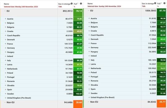 La data de 24 noiembrie 2025, potrivit https://agsi.gie.eu , depozitele din UE însumau 892,39 TWh, reprezentând un grad de umplere de 78,14%, în timp ce pe 24 noiembrie 2024 nivelul era de 1.006,58 TWh, cu un grad de umplere de 87,70%.