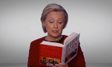 Chipul democratei Hillary Clinton a fost acoperit de carte în primele secunde ale apariţiei sale pe ecran, într-o înregistrare pregătită pentru gală, iar publicul a ovaţionat-o atunci când aceasta şi-a dezvăluit identitatea.