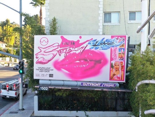 În afara anunţului făcut marţi seară, online, de Lady Gaga, un panou publicitar a fost montat în Hollywood.