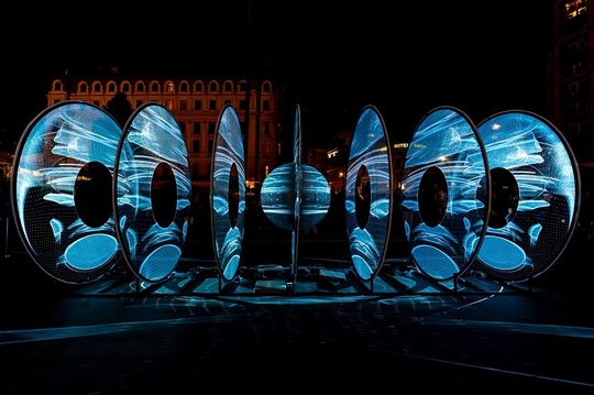 De asemenea, instalaţii ca Odonata (Number 8, FR) - libelule gigantice luminoase, Hulahoop (Collectif Scale, FR) - dansuri geometrice hipnotice, sau video mapping-urile celor de la Mindscape, Les Ateliers Nomad, H3, Noiselopp şi Vali Chincişan, pe cele mai emblematice clădiri de pe Calea Victoriei, au completat un traseu vizual spectaculos.