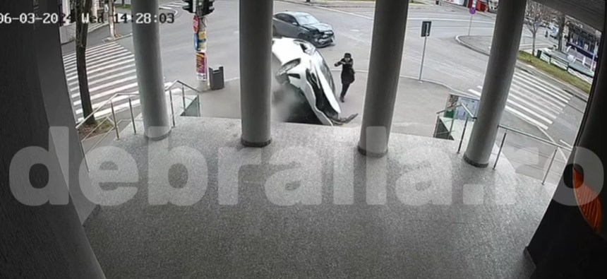 În imaginile care au surprins momentul impactului se vede cum maşina care a ajuns pe trotuar loveşte nişte scări şi se răstoarnă peste o femeie, eşi aceasta a încercat să se ferească. Femeia a fost rănită, fiind transportată la spital.