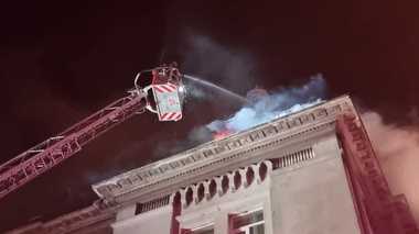 În urma incendiului, o turlă aflată pe clădire, cuprinsă de flăcări, s-a prăbuşit.