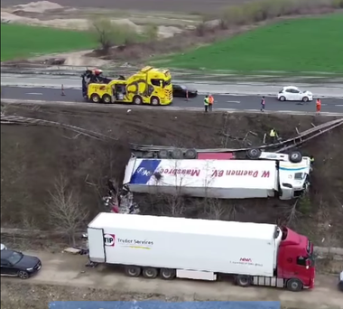 Şoferul unui autotren a pierdut controlul asupra direcţiei de mers, iar TIR-ul a ieşit de pe şosea, pe centura ocolitoare a Braşovului, a rupt parapetul de pe margine şi s-a răsturnat. În zonă a fost adusă o macara pentru ridicarea autotrenului rămas pe o parte, la o diferenţă de nivel de câţiva metri.
