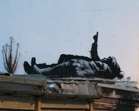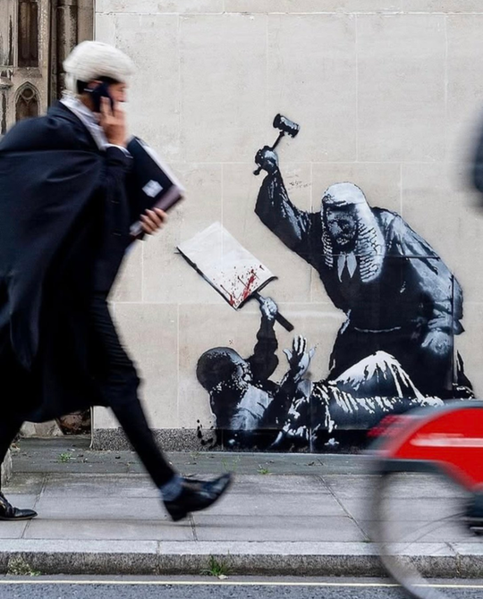 În septembrie, el a desenat, pe una dintre faţadele exterioare ale Royal Courts of Justice de la Londra, un judecător care agită un ciocan deasupra unui manifestant culcat pe jos cu o pancartă pătată de sânge.