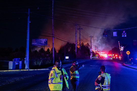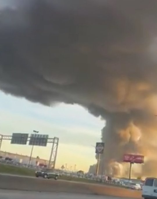 Mai multe clădiri dintr-o zonă industrială din spatele pistei au luat foc după accident, iar fumul negru şi dens se ridica în cerul serii.
