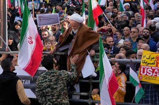 Unii participanţi agitau portrete ale liderului suprem iranian, ayatollahul Ali Khamenei, sau ale unor figuri ale alianţei - denumită ”Axa Rezistenţei” - condusă de către Teheran împotriva Israelului, inclusiv al fostului lider al mişcării islamiste libaneze Hassan Nasrallah, asasinat anul trecut într-un atac israelian în Liban.