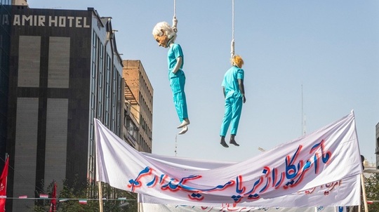 Deasupra mulţimii, manechine reprezentându-i pe preşedintele american Donald Trump şi pe premierul israelian Benjamin Netanyahu se balansau, spânzurate de o macara, la fel ca la execuţiile publice în Iran.