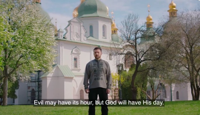 Purtând o cămaşă gri cu broderie tradiţională ucraineană, vîşîvanka, şi stând în faţa bisericii principale din Kiev, Catedrala Sfânta Sofia, Zelenski transmite, în videoclipul difuzat pe reţelele sociale, că Ucraina nu îşi pierde niciodată credinţa. „Pentru că această credinţă este în celălalt. În cei care vă stau alături. În bărbaţii ucraineni, în femeile ucrainene. În credinţa că răul îşi poate avea ora sa, dar Dumnezeu îşi va avea ziua sa”, spune Zelenski - care este evreu - într-un mesaj plin de lirism şi emoţie.