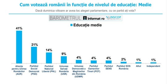Întrebaţi cu ce partid ar vota dacă duminica viitoare ar avea loc alegeri parlamentare, 41% dintre românii cu educaţie medie declară că ar alege AUR, 21% PSD, 14% PNL, 9% USR, 4% UDMR, 4% POT, 4% SENS, iar 2% SOS România. 1% aleg alt partid şi 1% un candidat independent.