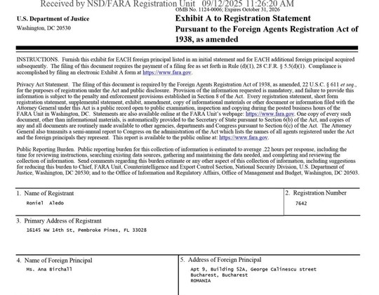 Roniel Aledo a depus declaraţii referitoare la relaţia cu Birchall, în conformitate cu Foreign Agents Registration Act, documentele fiind datate 11 septembrie 2025 şi având data de înregistrare şi publicare 12 septembrie.