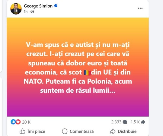 „V-am spus că e autist şi nu m-aţi crezut. I-aţi crezut pe cei care vă spuneau că dobor euro şi toată economia, că scot România din UE şi din NATO. Puteam fi ca Polonia, acum suntem de râsul lumii.„, a scris Simion pe Facebook sâmbătă seară.