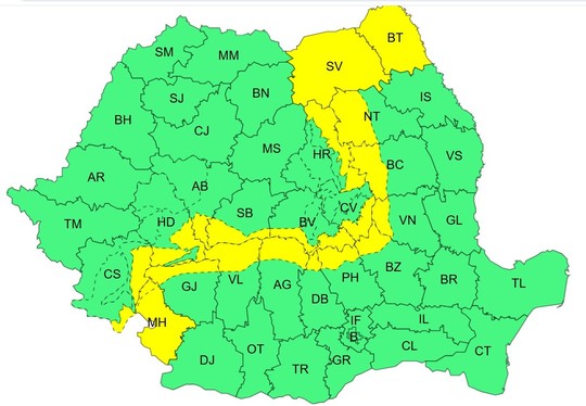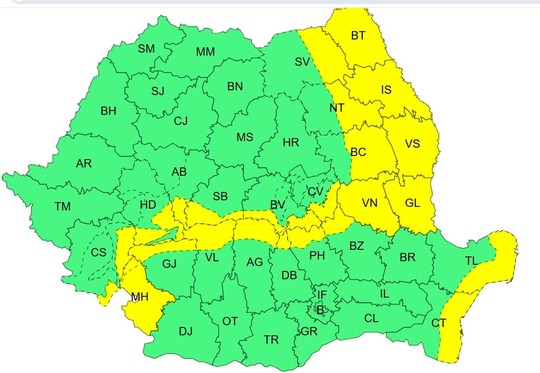 O atenţionare meteorologică cod calben vizează intervalul 26 decembrie, ora 14 – 27 decembrie, ora 16. ” Temporar, vântul va avea intensificări în cea mai mare parte a Moldovei, în vestul Olteniei şi pe litoral cu viteze de 50...70 km/h. În Carpaţii Meridionali şi de Curbură vor fi rafale de 70...80 km/h, iar în zona înaltă de 90....120 km/h, viscolind zăpada depusă”, precizează meteorologii.