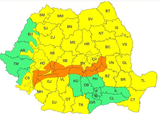 În acelaşi interval, este valabilă şi o avertizare cod portocaliu, fiind anunţate intensificări puternice ale vântului, viscol şi vizibilitate foarte redusă în zona înaltă a Carpaţilor Meridionali şi de Curbură.