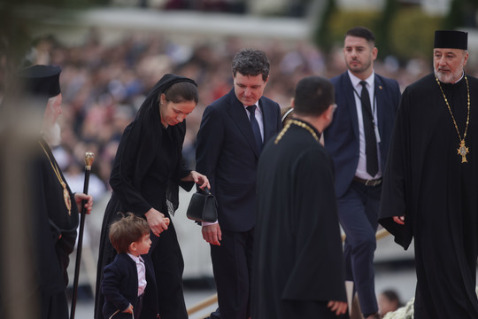 Ultimul sosit în imensa catedrală a fost şeful statului, Nicuşor Dan, împreună cu partenera sa de viaţă Mirabela Grădinaru şi cu cei doi copii Aheea şi Antim, a căror dezinvoltură a stârnit zâmbele celor din jur.